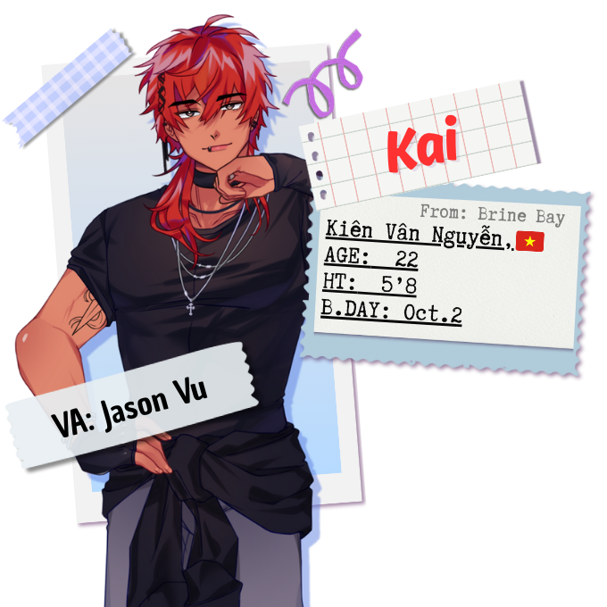Easygoing, prone to flirting but lacking the wit for clever wordplay, Kai is a mechanic at his family's garage. Though, his whims and friends seem to take him to just about everywhere except there, which might be a problem considering you're counting on him to get out of Brine Bay.