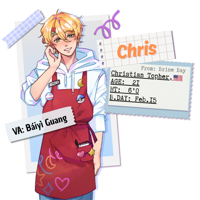 There's a calm maturity to his mindfulness. His optimism and light doesn't come from a place of naivety, but rather experience and necessity. Chris has placed himself firmly in the role of the reliable and steady caretaker. The only exception to this is his childhood friend Kai, who has always been the one to give Chris a place to relax. As his workload piles up and things become more difficult to manage, though, he's began to pull away from even him in fear of burdening his friend.