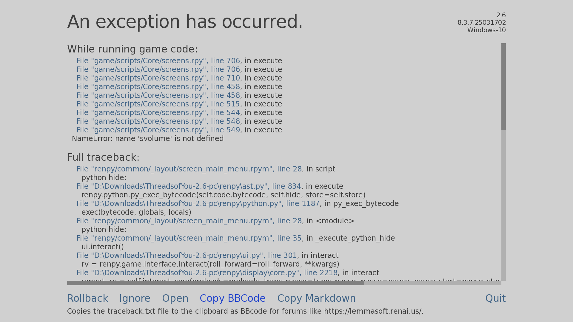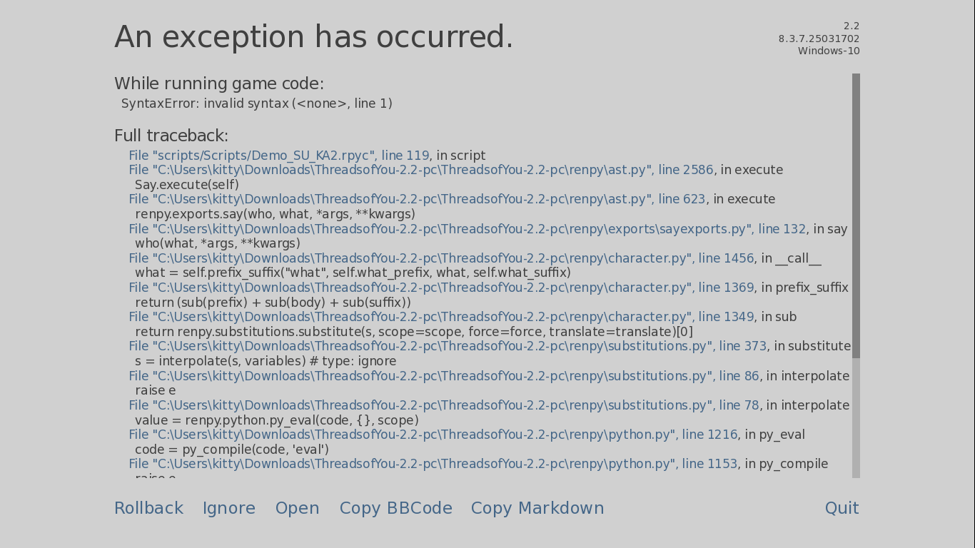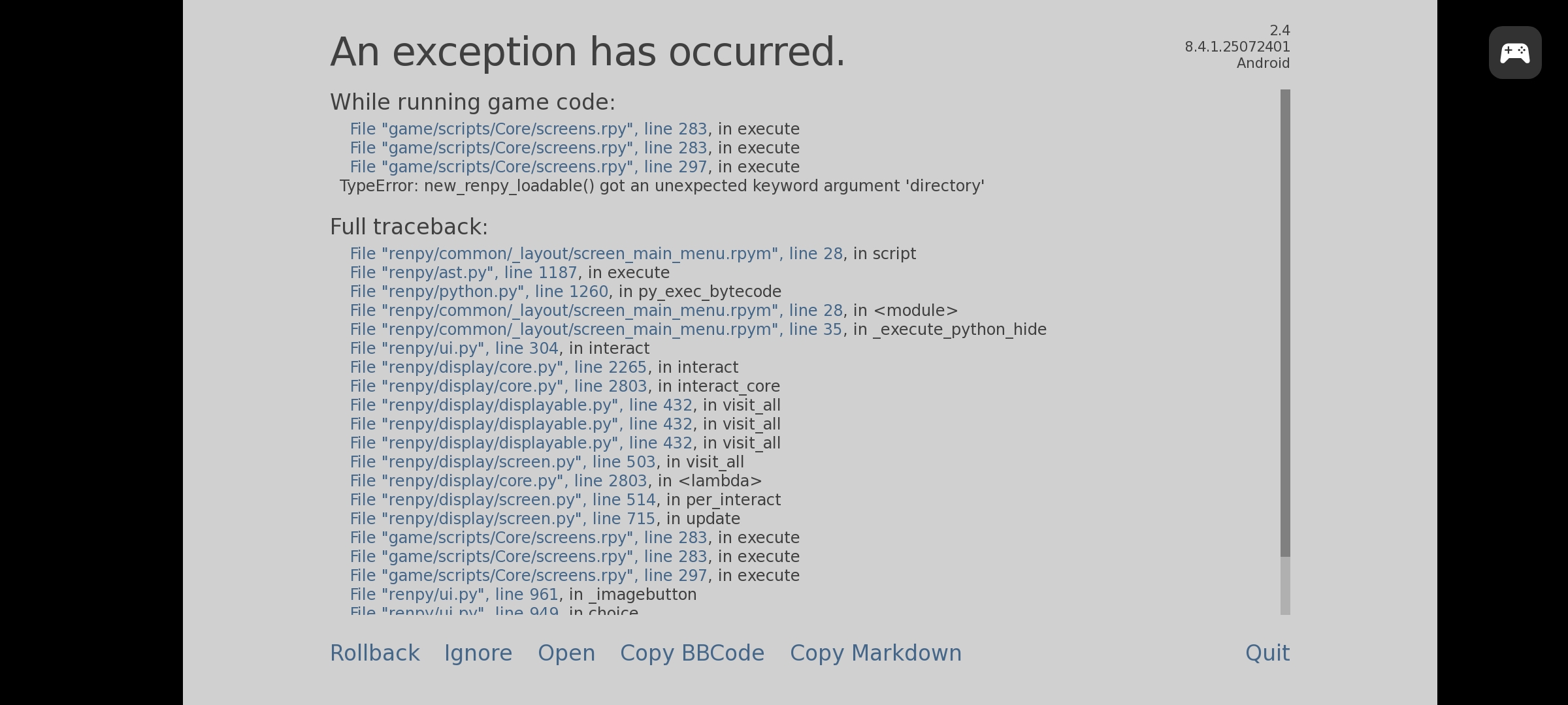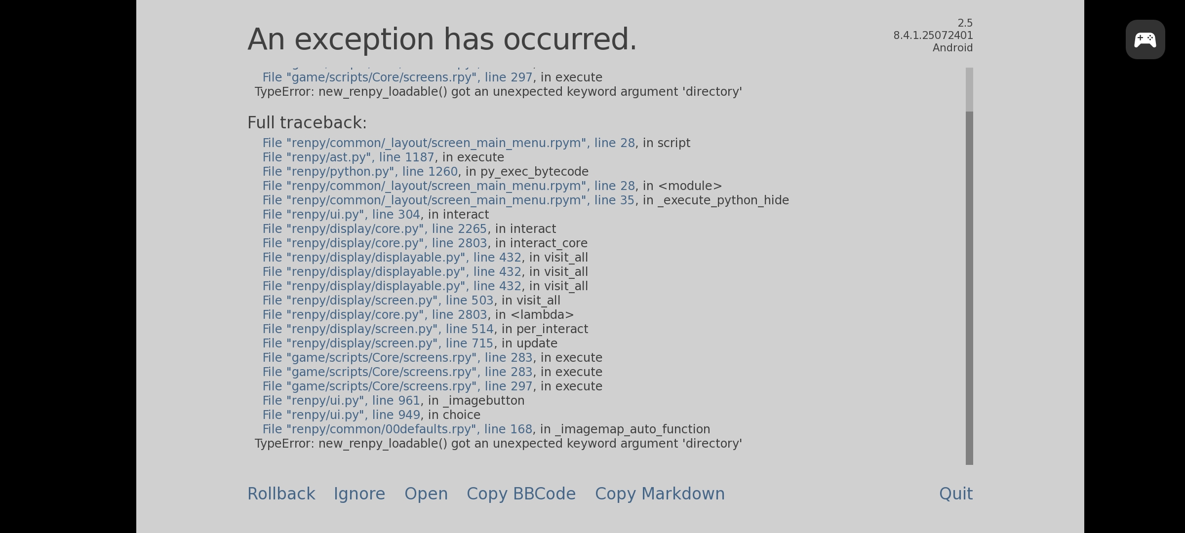Joiplay version doesn't matter. I think you are running the Ren'Py plugin 8.4.1, which changed a lot of stuff and fails at reading older versions code. You need to install the Ren'Py plugin 8.3.7, that's the one that was used to make the game: )